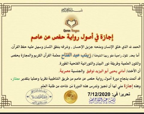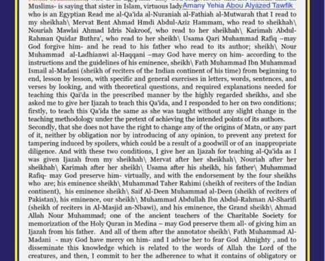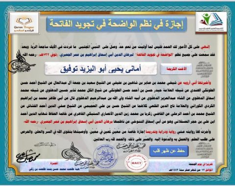 Die Gründerin Amany Yahya ist Absolventin der Azhar Universität in Kairo, Ägypten. Dort hat sie ihren Bachelor in Sozialpädagogik absolviert. Parallell dazu hat sie den gesamten Quran auswendig gelernt und ist somit berechtigt den edlen Quran zu lehren und andere Frauen auszubilden. Sie besitzt in den folgenden Bereichen Ijaazat (Zeugnisse):