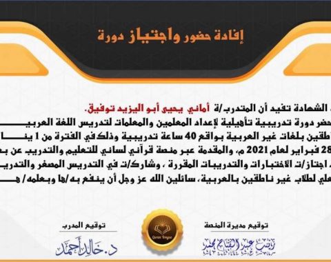 Teilnahmebestätigung über Seminar “Unterrichten der arabischen Sprache für Nichtaraber”