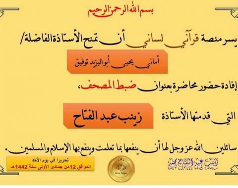 Teilnahmebestätigung für Seminar über die Schrift des Mushaf